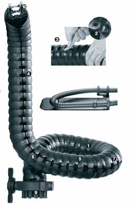 1. Multiakse-bevægelse - Høj fleksibilitet for komplekse applikationer selv på 6. akse. Mulighed for rotation på ca. ± 10° pr kædeled langs den langsgående akse. Dette forenkler kabelføring omkring problematiske former