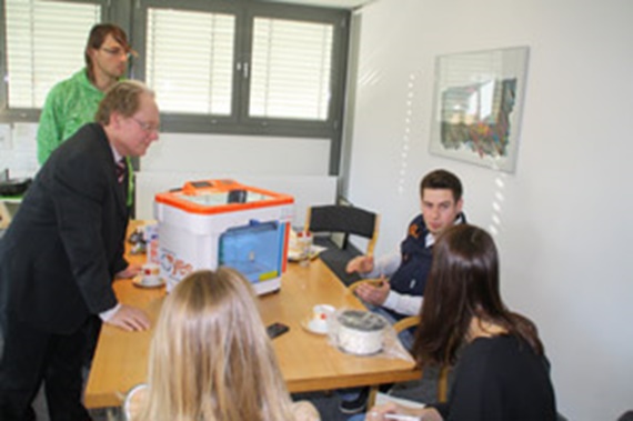 Vores medarbejder forklarer, hvordan printeren virker til redaktøren af Kölner Stadtanzeiger (Kölns lokalavis), skoleinspektøren og eleverne under det tekniske kursus.