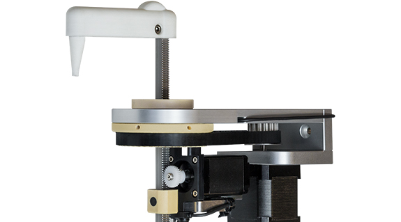 drylin® løfte/dreje enhed, baseret på et snekkedrev med coated aluminiums 4-kant profil samt rundt bordelement med integreret fortanding