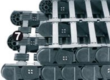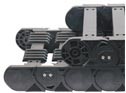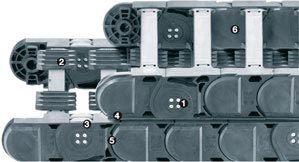 igus® P4-systemet med lave vedligeholdelseskrav gør det muligt at implementere et pålideligt energiforsyningssystem på lange vandringer op til 800 m til kranudstyr eller transportbåndssystemer. Rullerne til den øverste og nederste del er forskudt i forhold til hinanden. Det betyder, at ingenting ruller over de tribo-optimerede plastruller, men at de i stedet kan rulle på en kontinuerlig, bred rulleoverflade. De kamagtige autoglide-ribber og det specielle styreskinnesystem fører pålideligt P4 E-Kæden. Ideel til anvendelser med høje vandringshastigheder (op til 10 m/s) og tunge fyldvægte (op til 30 kg/m)