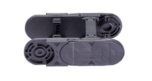 The tool is usually made of steel and is split in two. One part is installed on a fixed mounting plate, the other one on the moving mounting plate. Once both parts are joined, a hollow space is created inside, the so-called cavity. The material now enters this hollow space from the injection unit through a nozzle in the mounting plate. The pressure of the screw should completely fill the cavity. The injection speed is important here, for it influences how the material distributes in the tool; finally, no hollow spaces should be formed. Once the sealing point is reached, the clamping unit shuts off the flow of the material from the tool and the material starts to cool down in the tool. Afterwards, the tool is opened and the completed plastic parts can be removed. Besides the actual injection-molded part, the shape that the plastic part is meant to have in the end, there also exists the gate. That is the part which "projects", because the liquid material has to go into the tool through an opening. This projecting part is then removed by a gate picker.
