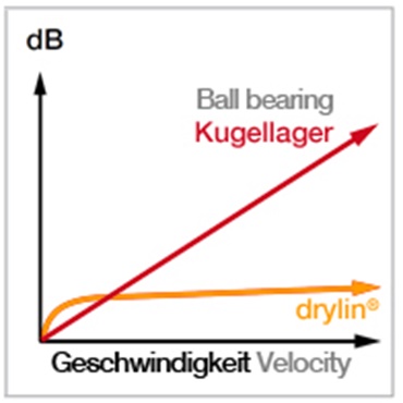 Driftsstøjen også stærkt reduceret ved at skifte driftsprincippet fra rullende til glidende. Der forekommer ikke mekanisk rulning mod et hårdt glideemne, og ingen kuglesammenstød, der kan forårsage støj.
