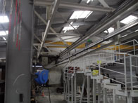 With this application, concrete containers are moved over a length of 50 metres in a hall. The material concrete presents the logistics components used with a special challenge, since it is dusty and brittle or damp, depending on its state. The cable loop used previously for control did not work reliably in the given environmental conditions, with the humidity regularly causing the power circuits to short-circuit.