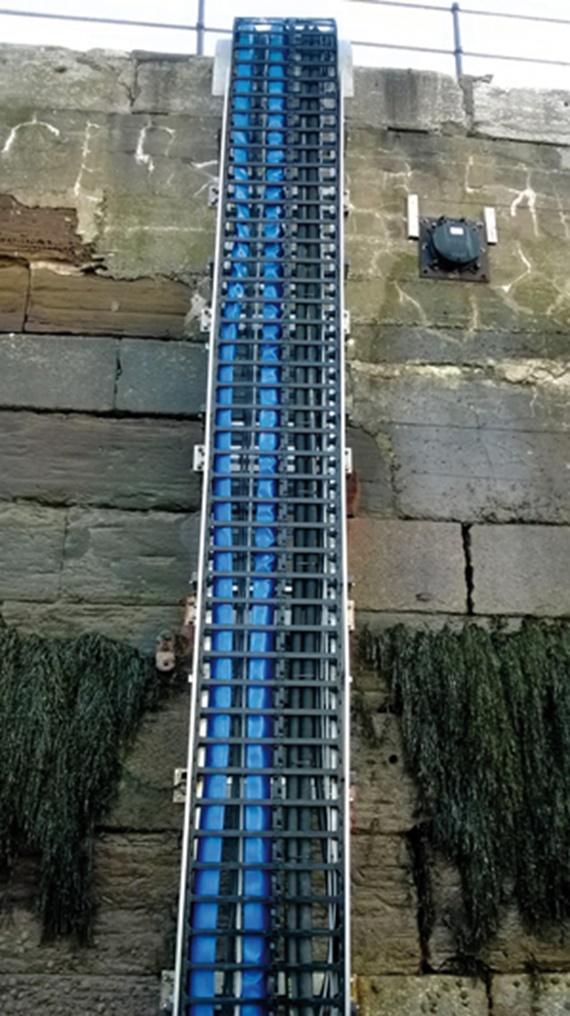 The service boats of a wind farm operator are prepared for use at this pontoon in Barrow-in-Furness, Great Britain. For this purpose, diesel lines as well as hoses and cables for Lenz pumps are routed from the land onto the pontoon. A 20 metre e-chain® from the 1640 series from igus was used to protect these reliably from damage in this rough environment. This even routes the 100 millimetre thick fuel lines safely to where they are required, and is completely insensitive to salty air and rough sea.